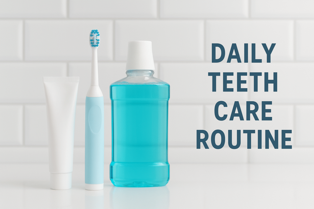 A clean bathroom countertop with a toothbrush, toothpaste, and mouthwash labeled “Daily Teeth Care Routine.”